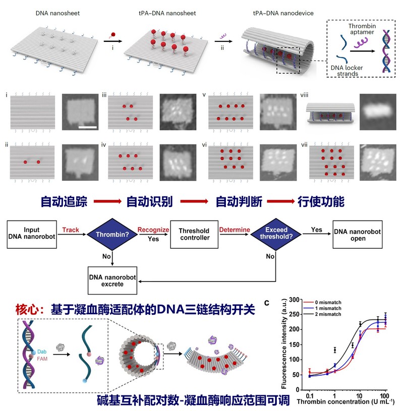 由血栓造成的血管阻塞性疾病已超越癌癥成為全球致死率最高的疾病,是危及人類的頭號殺手。溶栓治療是當前臨床針對中風、心梗、肺栓塞等急性血栓的首選治療方案,以組織纖溶酶原激活劑tPA為代表的溶栓藥物可激活體內纖溶酶,從而溶解血栓的主要成分纖維蛋白。然而溶栓藥物是一把雙刃劍,過度激活的纖溶酶會無差別溶解纖維蛋白導致機體凝血功能異常,造成嚴重的出血并發癥而危及生命。因此,實現只針對血栓的精準給藥是未來溶栓治療的發展方向,為更多血栓患者的治療和康復帶來希望。1959年著名物理學家費曼曾預言“可吞下的外科醫生”,設想了可注射的微型機器在醫學中的應用。DNA納米技術以人體的四種堿基為基本單元,精確構筑功能模塊并通過有序自組裝可實現自動執行系列任務的納米機器。