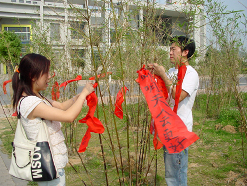 中國江蘇網消息:6月17日下午,南京郵電大學一群即將畢業的大四學生來到仙林校區,將一條條紅絲帶系在學徑兩邊的竹枝上,“請記住陽光總在風雨后,一起加油吧!”、“一個今天勝過兩個明天”、“寄語學弟學妹:努力與快樂同在!”、“當自己都不知自己在干什么的時候,就是該好好思考自己的時候”、“重要的不是所站的位置,而是所朝的方向”、“少玩游戲,多上自習”、“I believe you can fly”……,這些紅絲帶上的話語,有的是自身的經驗傳授,有的是發自內心的祝福,有的是誠懇的勸勉,飄揚的絲帶引來不少在仙林的南郵學子駐足觀看,以紅絲帶表達學長的心意這種方式,讓平時較少有機會接觸學長的一二三年級學生以一種別樣的心情感受到了溫情的傳遞。