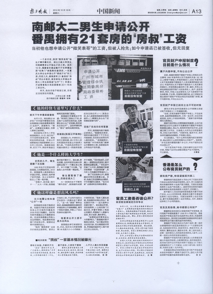 【揚子晚報】南京大二男生申請公開番禺擁有21套房的房叔工資