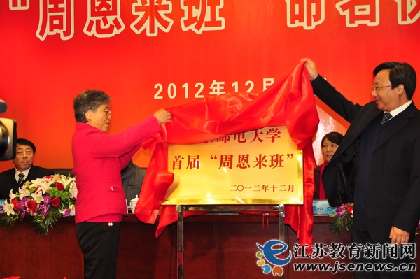 12月22日,南京郵電大學舉行首屆“周恩來班”命名儀式。該校人文與社會科學學院2011級公共事業管理班被命名為“周恩來班”。周恩來鄧穎超秘書、全國政協原副秘書長、周恩來思想生平研究會顧問、周恩來鄧穎超研究中心顧問趙煒和南京郵電大學黨委書記劉陳共同為該校“周恩來班”揭牌。