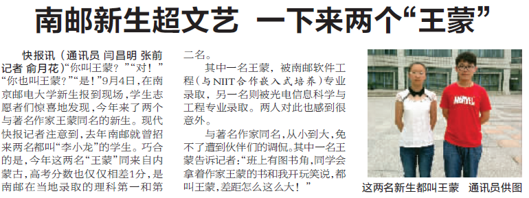 【現代快報】南郵新生超文藝 一下來了兩個“王蒙”