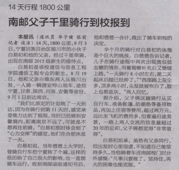 【南京日報】南郵父子千里騎行到校報到