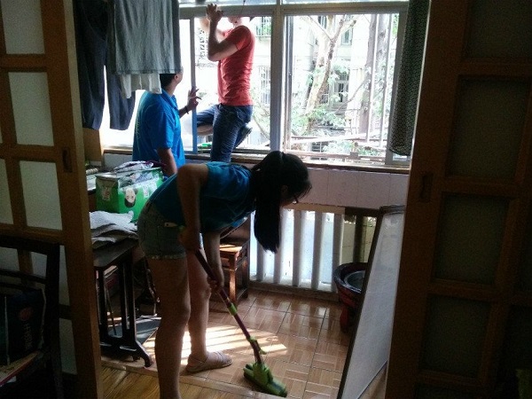 志愿者在擦玻璃、打掃房間 中國青年網通訊員秦爽提供