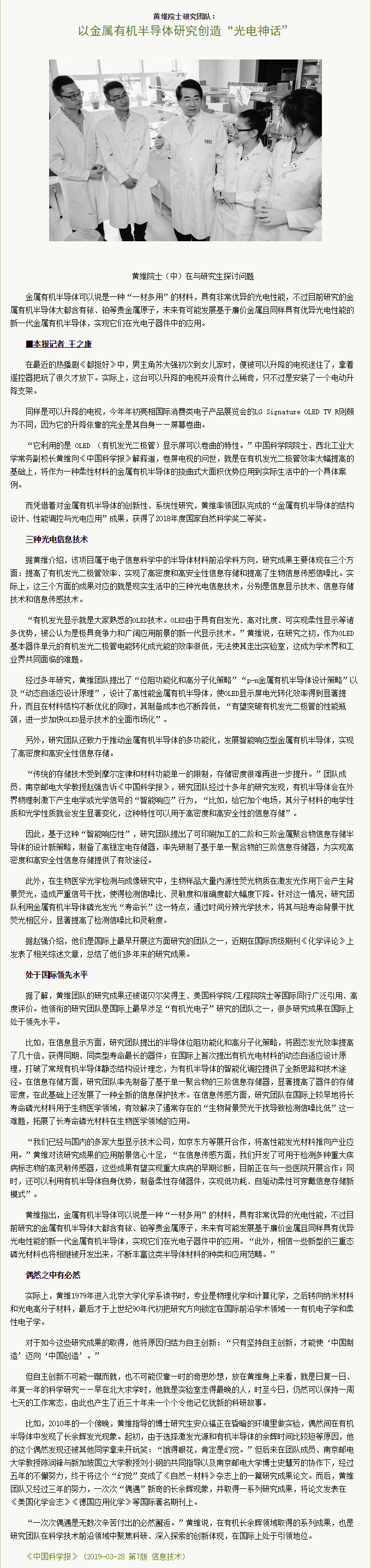 【中國科學報】以金屬有機半導體研究創造“光電神話”