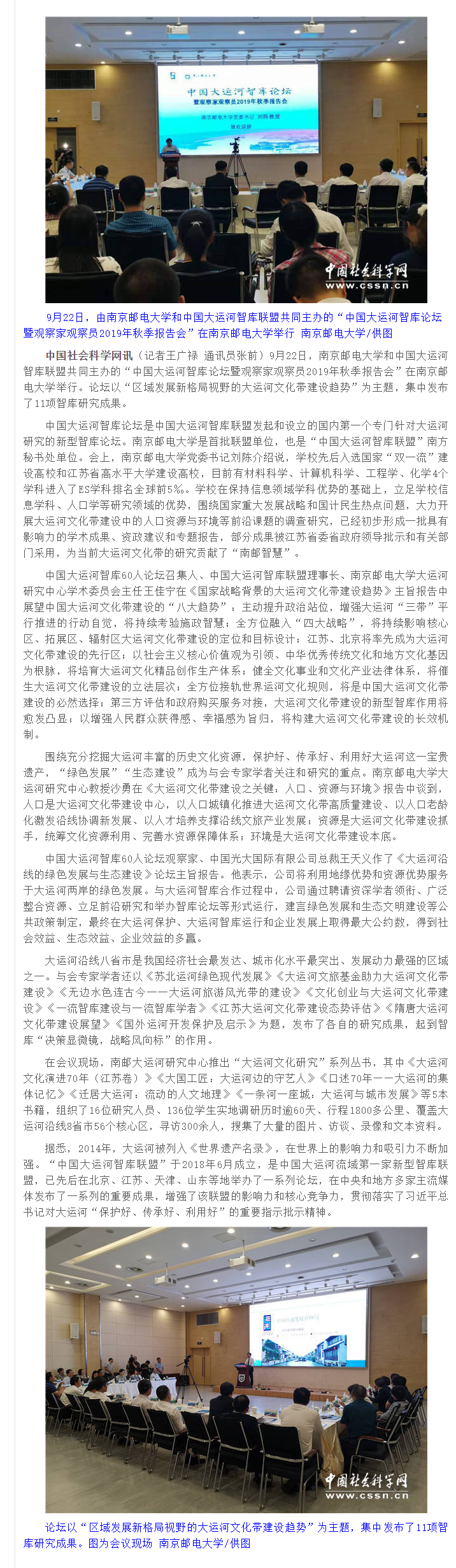 【中國社會科學網】中國大運河智庫論壇暨觀察家觀察員2019年秋季報告會在南京郵電大學舉行