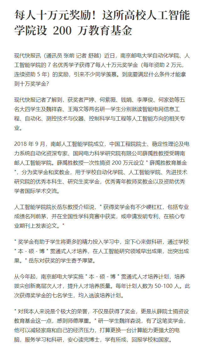 【現代快報全媒體】每人十萬元獎勵!這所高校人工智能學院設 200 萬教育基金