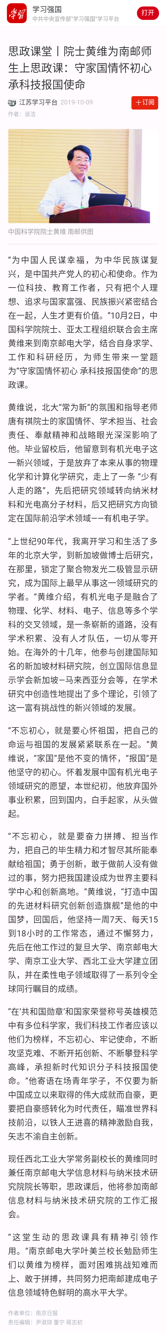 【學習強國】院士黃維為南郵師生上思政課:守家國情懷初心 承科技報國使命