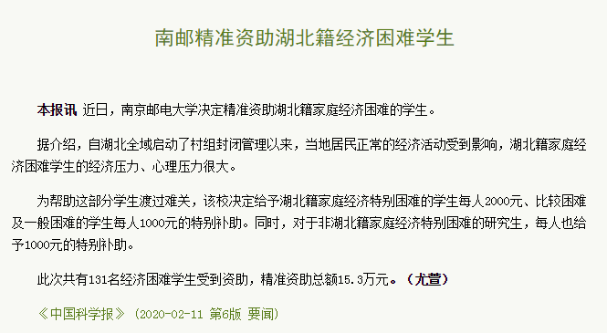 【中國科學報】南郵精準資助湖北籍經濟困難學生