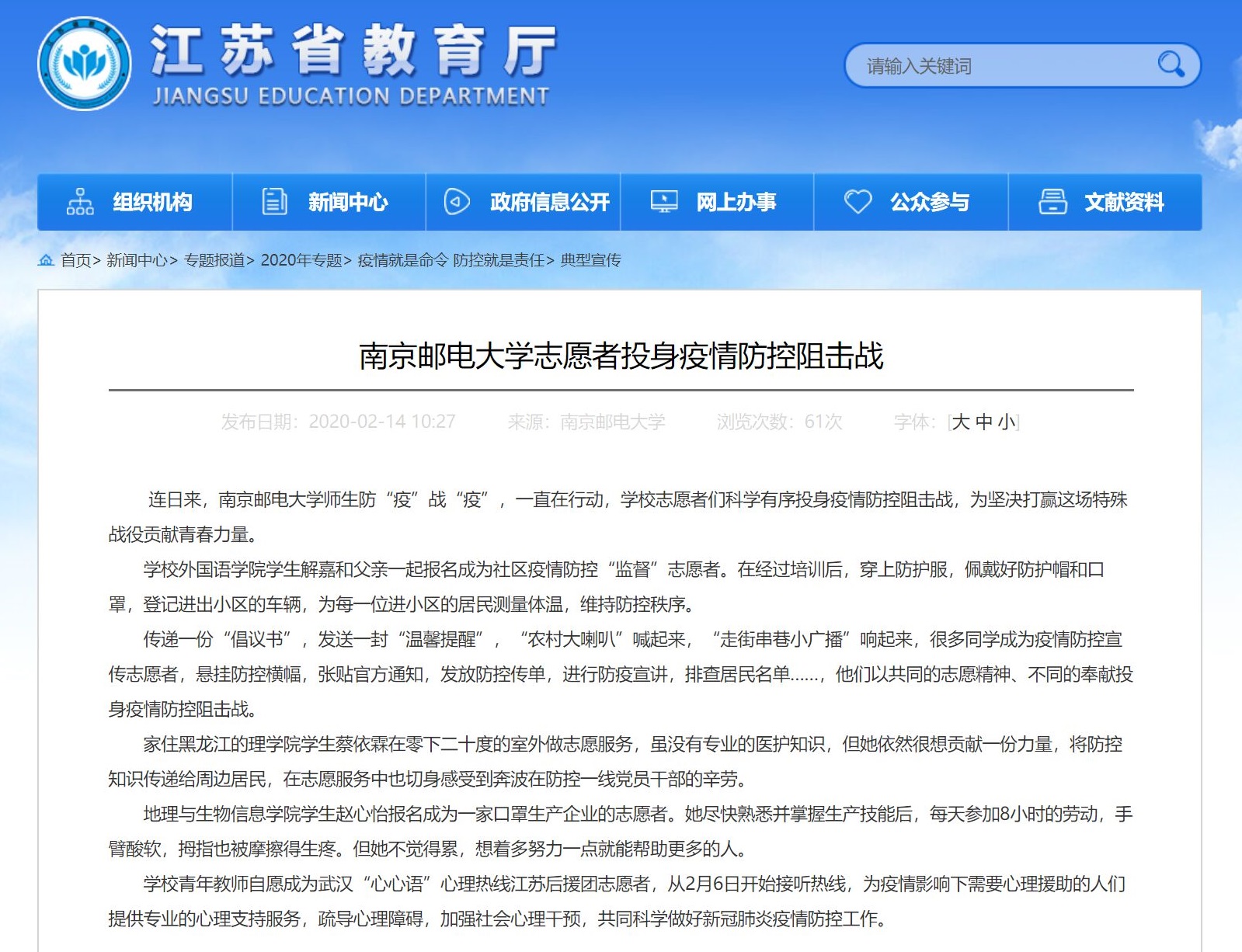【省教育廳官網(wǎng)】南京郵電大學(xué)志愿者投身疫情防控阻擊戰(zhàn)