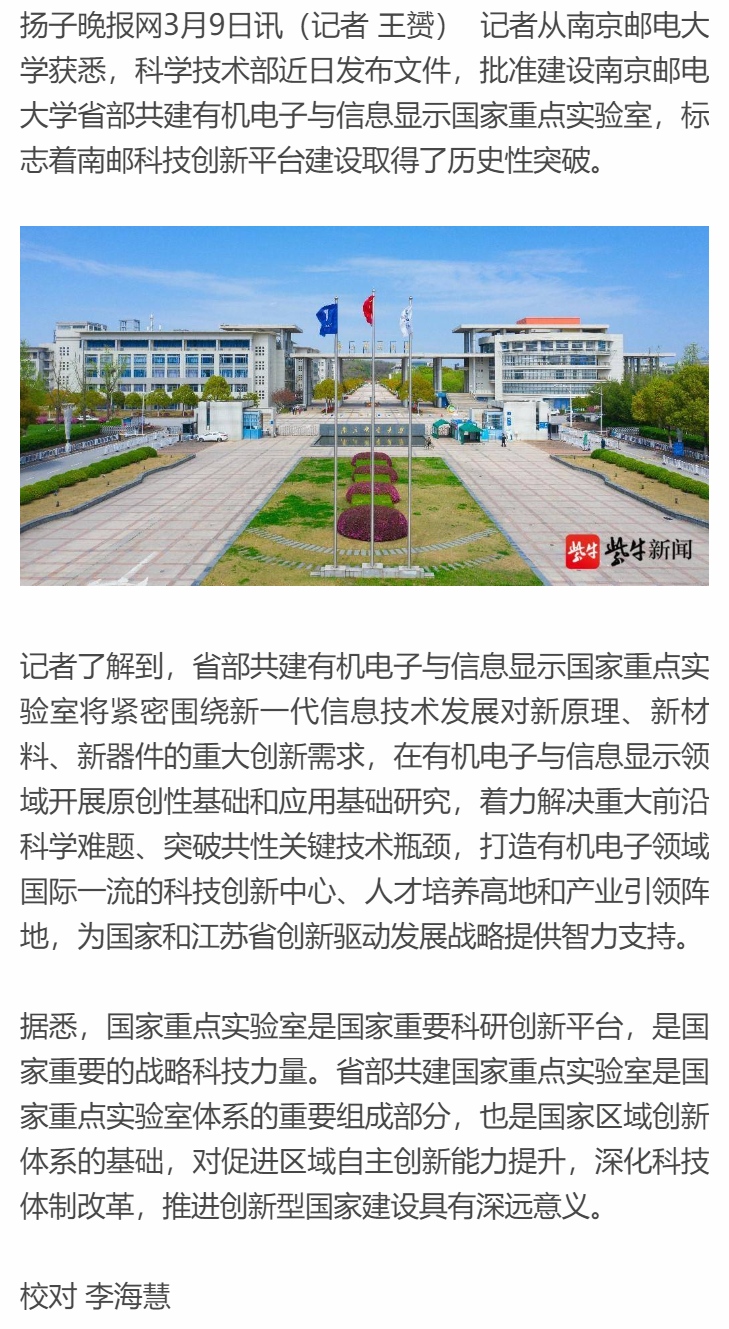 【揚子晚報客戶端】最新!南郵省部共建有機電子與信息顯示國家重點實驗室正式獲批建設