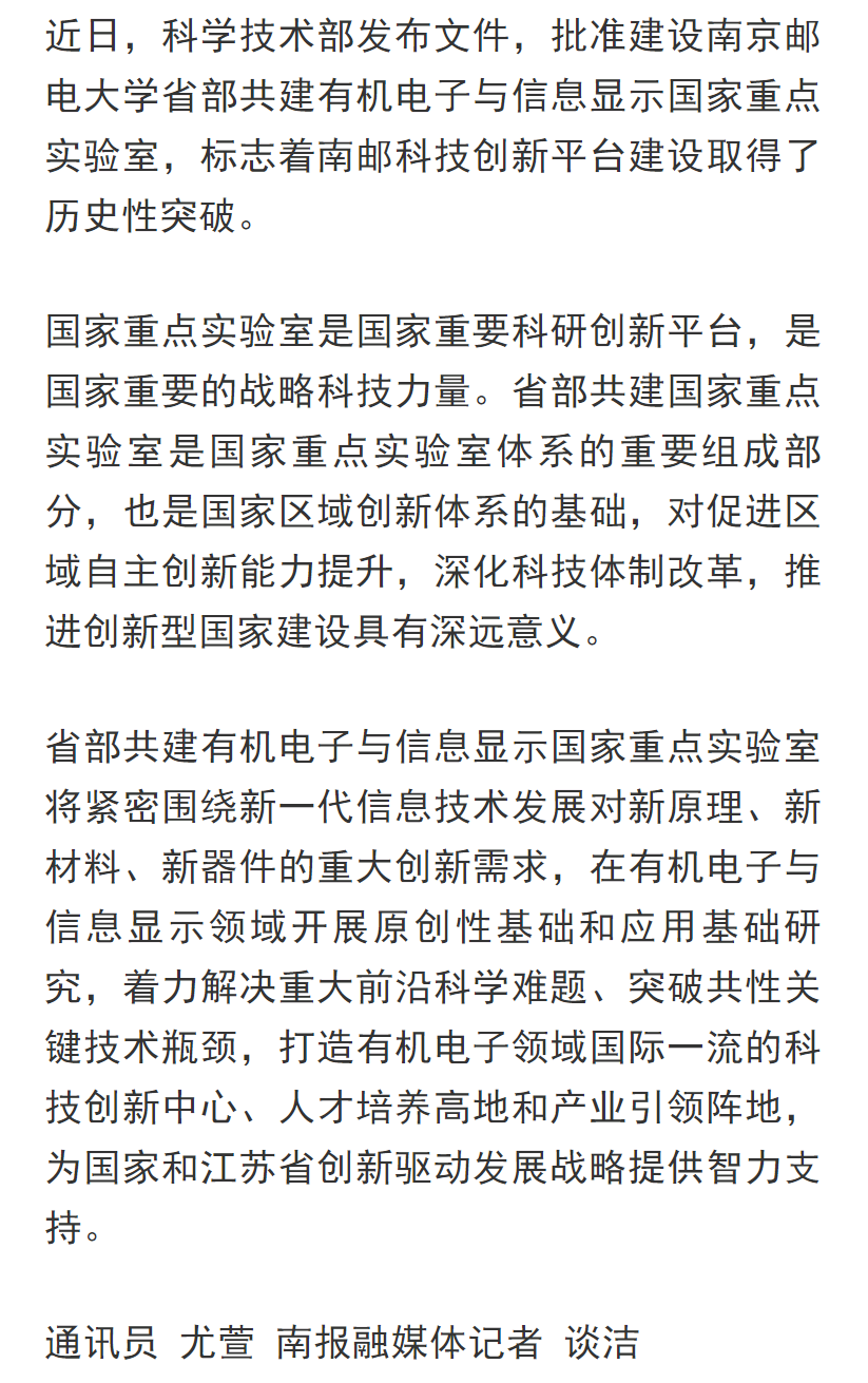 【南京日報客戶端】研究有機電子與信息顯示,南郵省部共建國家重點實驗室獲批