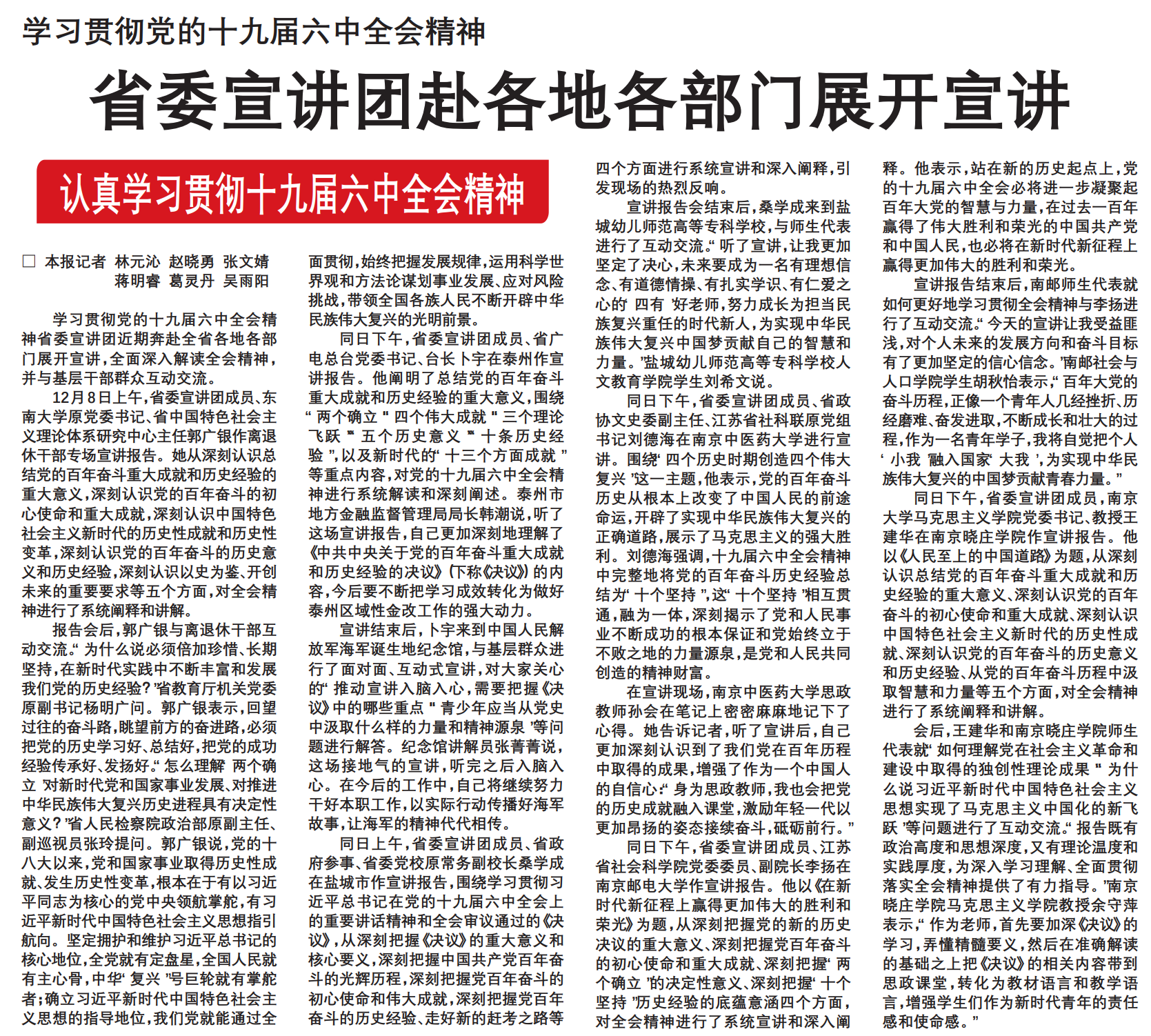 【新華日報】學習貫徹黨的十九屆六中全會精神 省委宣講團赴各地各部門展開宣講