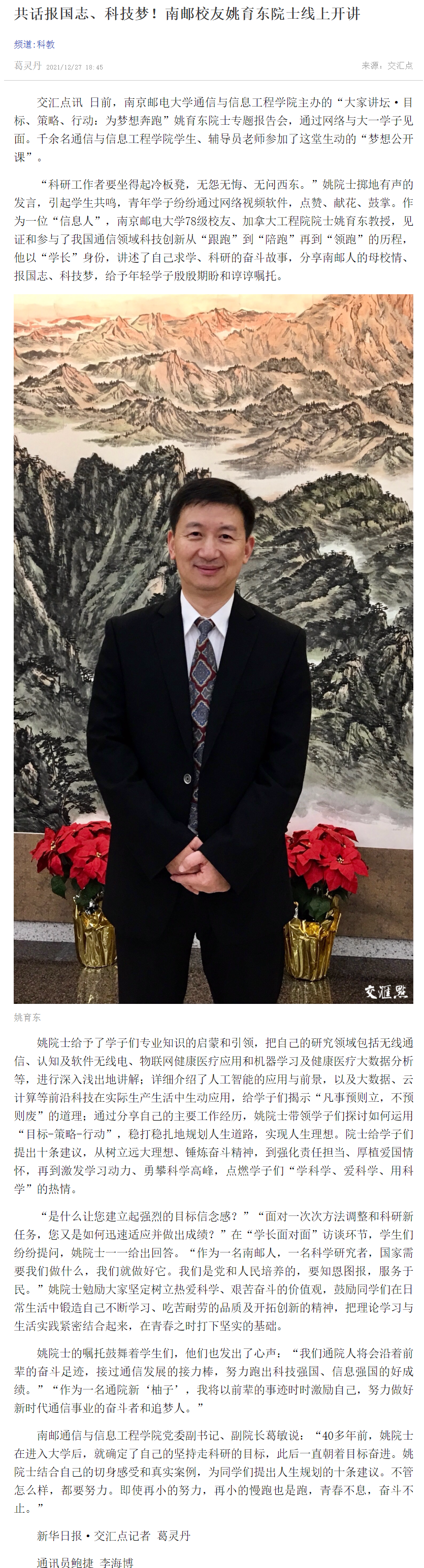 【新華日報客戶端】共話報國志、科技夢!南郵校友姚育東院士線上開講