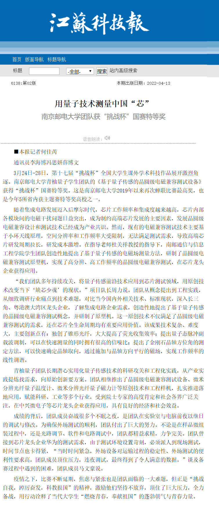 【江蘇科技報】用量子技術測量中國“芯” 南京郵電大學團隊獲“挑戰杯”國賽特等獎