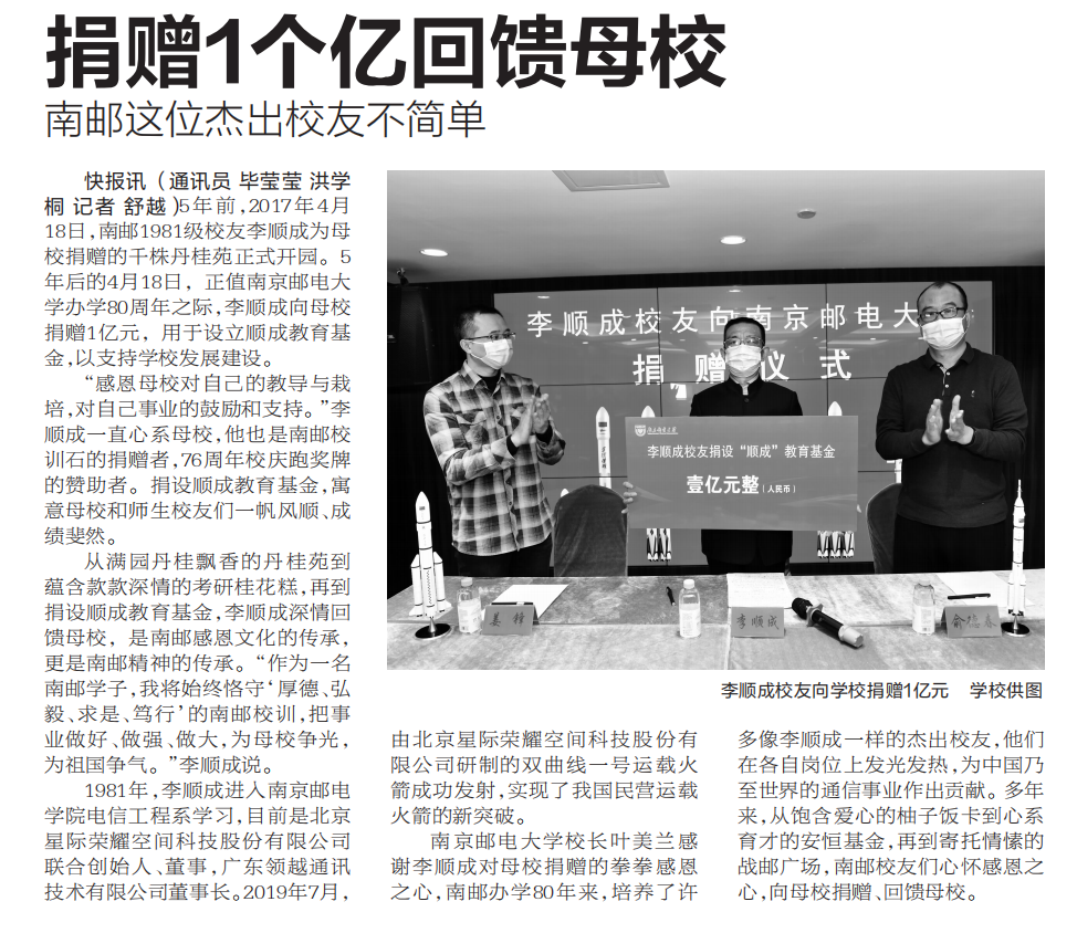 【現代快報】捐贈一個億回饋母校 南郵這位杰出校友不簡單