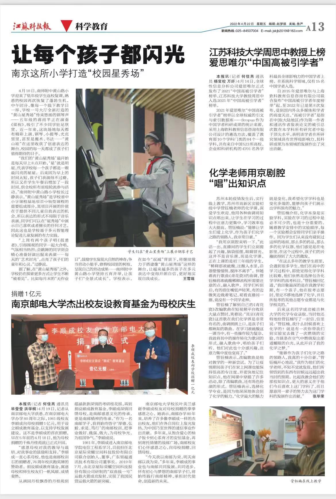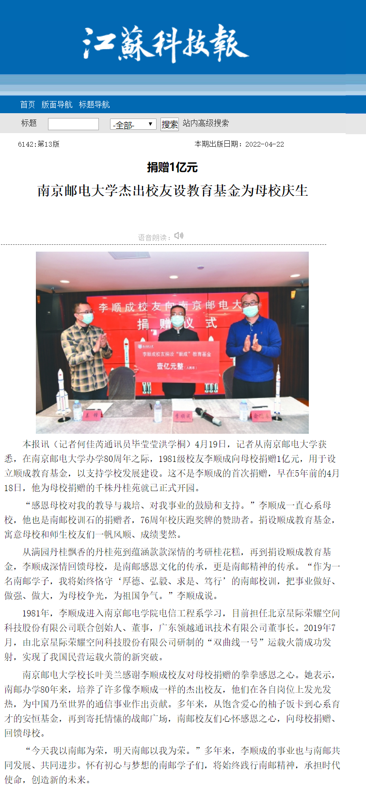 【江蘇科技報(bào)】捐贈(zèng)1億元 南京郵電大學(xué)杰出校友設(shè)教育基金為母校慶生