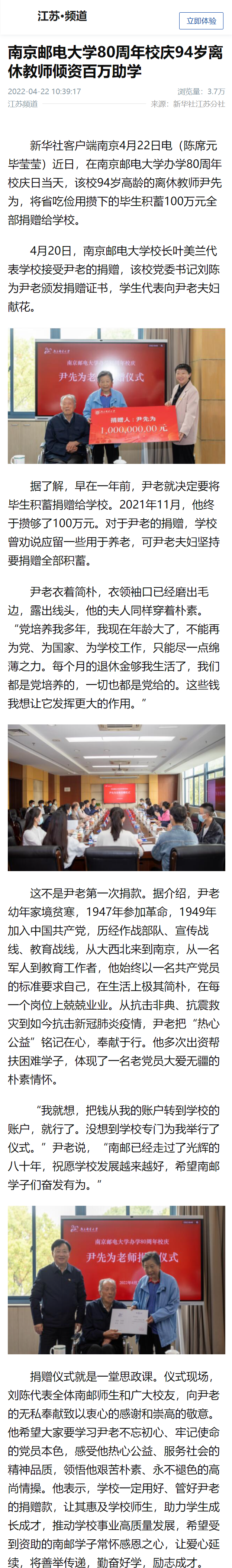 【新華社江蘇頻道】南京郵電大學80周年校慶94歲離休教師傾資百萬助學