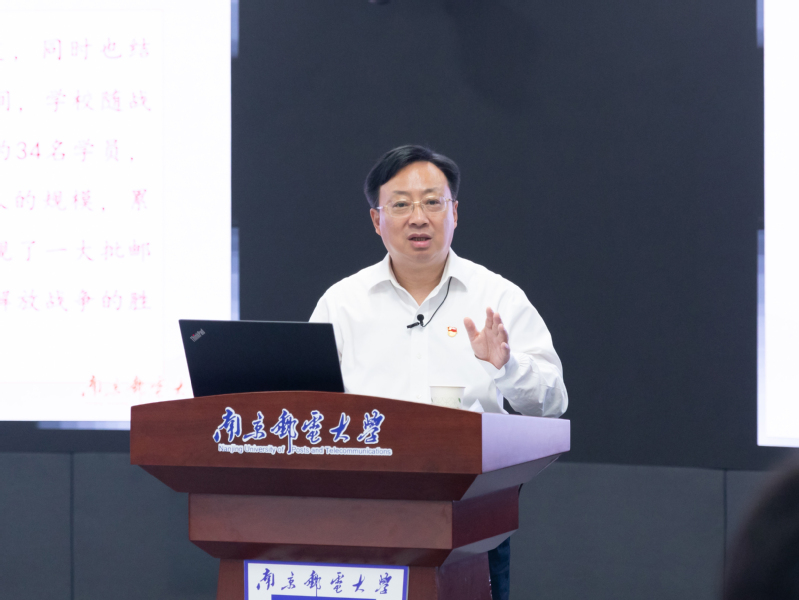 “學習南郵校史,也是學習黨史、中國革命史、新中國建設史的一個過程。”劉陳書記以《戰火生根 熱血鑄魂》為題,從“學史鑄魂:學習南郵校史的重要意義”“南郵發源:抗日戰爭時期的戰郵干訓班”“數易校名:在解放戰爭中輾轉壯大”“定址南京:結束8年的戰爭歲月辦學歷史”“賡續精神:繼承和發揚南郵的紅色基因”五個部分,講了一堂生動的“大思政課”。