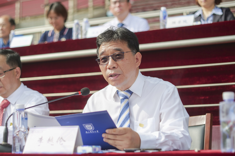 開學典禮上,主席臺就座領導為新生代表佩戴學校徽章。全體師生同唱《信達天下》校歌。