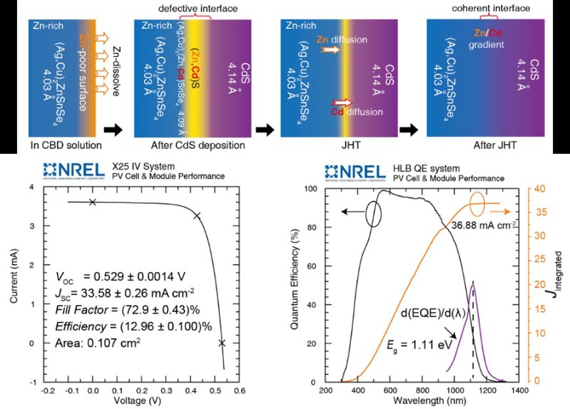 鋅黃錫礦(Kesterite)結構的銅鋅錫硫硒(Cu2ZnSn(S,Se)4,CZTSSe)半導體材料由于組成元素毒性低,原料地球儲量大,且具備與銅銦鎵硒(Cu(In,Ga)Se2,CIGS)半導體相似的晶體結構和光電學特性,是一種具有巨大潛力的新型綠色低成本光伏材料。然而,自2013年以來,CZTSSe太陽能電池記錄轉換效率長期停滯在12.6%,遠遠低于CIGS太陽能電池的23.35%。限制CZTSSe太陽能電池性能的關鍵問題是巨大的開路電壓損失,其中CZTSSe/CdS異質結界面嚴重的非輻射復合是導致器件開路電壓損失的重要原因之一,然而目前對異質結界面缺陷的形成機制還不清楚。