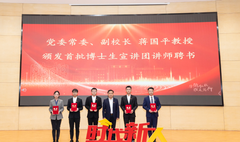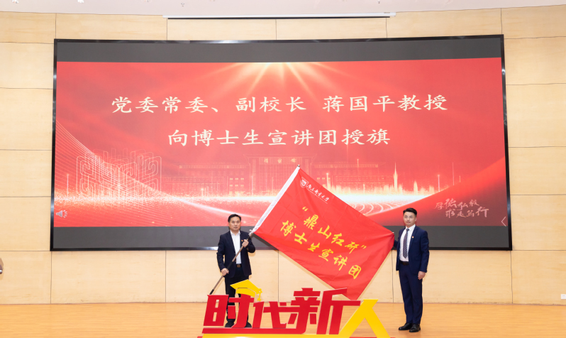 蔣國(guó)平副校長(zhǎng)為博士生宣講團(tuán)授旗,為首批講師頒發(fā)聘書(shū)
