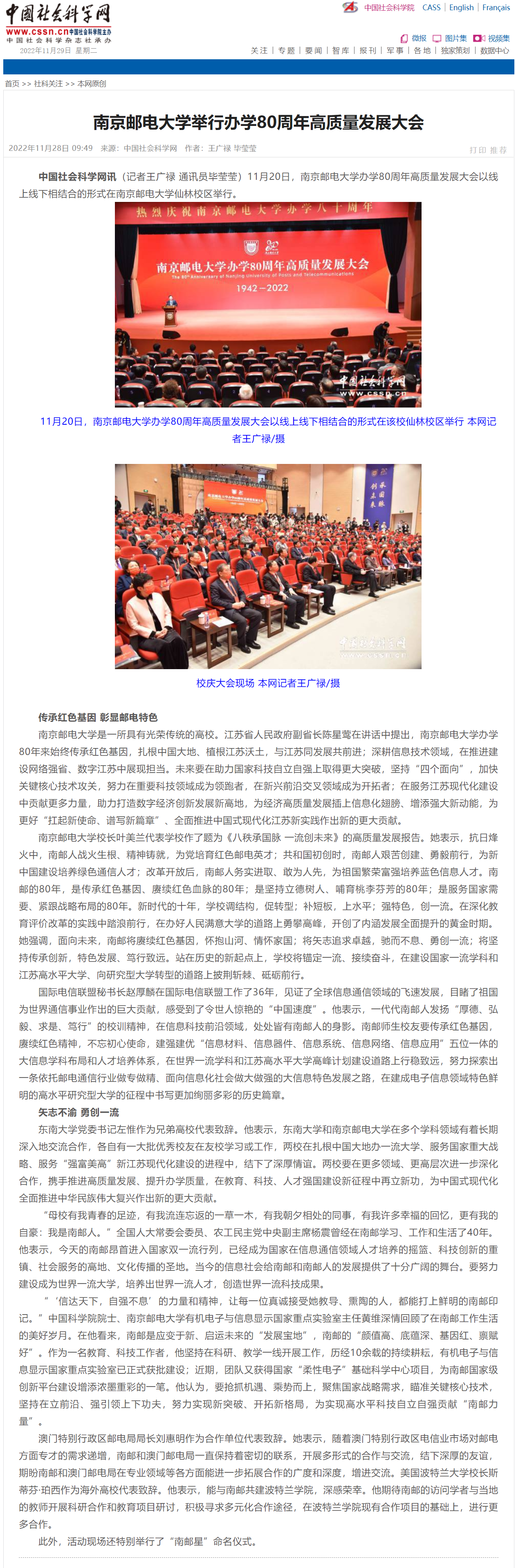 【中國社會科學網】南京郵電大學舉行辦學80周年高質量發展大會