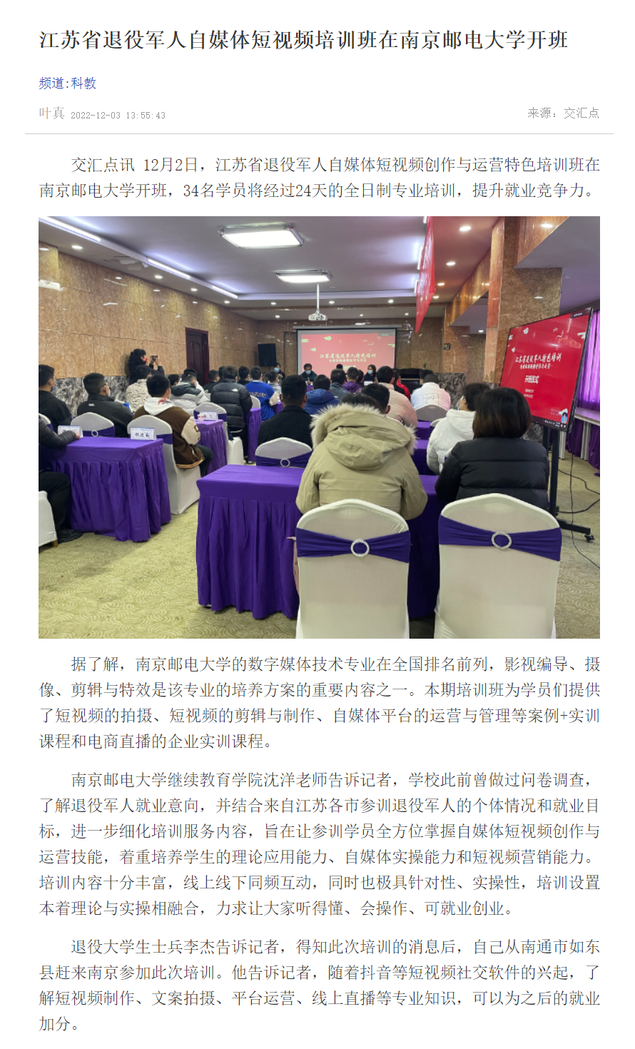 【新華日報客戶端】江蘇省退役軍人自媒體短視頻培訓班在南京郵電大學開班