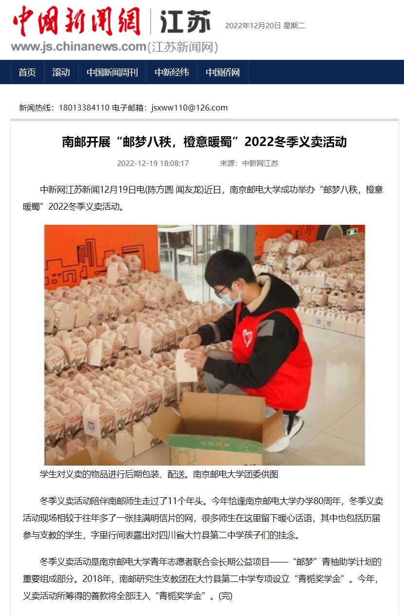【中國(guó)新聞網(wǎng)】南郵開(kāi)展“郵夢(mèng)八秩,橙意暖蜀”2022冬季義賣(mài)活動(dòng)