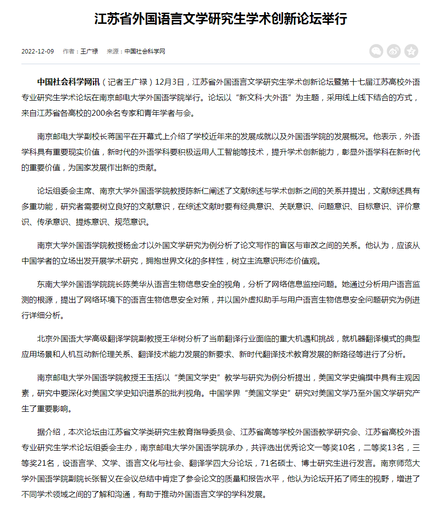 【中國社會科學網】江蘇省外國語言文學研究生學術創新論壇舉行