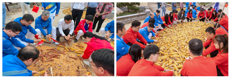 途中,師生們看到豐收的玉米堆滿了村民門口的空地,大家自發地與村民一起剝起了玉米。剝、扔、搓,村民們用熟練的動作為師生們示范如何將玉米剝得又快又省力,師生們爭相學習、比著練習,仿佛又回到了當年戰郵干訓班學員和村民一起勞動的時光。