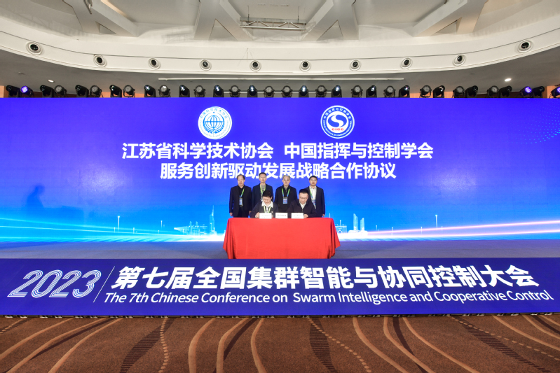 在中國指揮與控制學會名譽理事長戴浩院士、學會副秘書長宋鵬、董希旺等見證下,江蘇省科學技術協會副主席李千目和學會副秘書長宋榮分別代表雙方簽署了《服務創新驅動發展戰略合作協議》戰略合作協議。