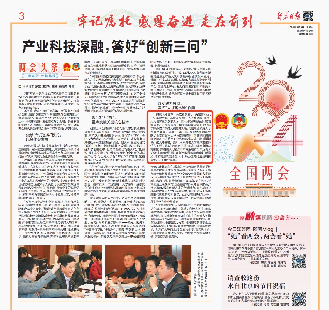 高校人才培養一頭連著教育、一頭連著科技、一頭連著產業。“高校要發揮好‘人才蓄水池’作用,大力培育拔尖創新人才、深入推動產教融合,賦能新質生產力加快發展。”南京郵電大學黨委書記郭宇鋒介紹,“我們扎根江蘇大地,構建政企校所人才發展共同體。實施‘一市一院’校地協同創新戰略。”由南京郵電大學與南通市崇川區共建的南通研究院是國內首個工業和信息化集成電路封測領域產業人才基地。去年,南京郵電大學集成電路科學與工程學院(產教融合學院)正式入駐南京浦口高新區,開啟集成電路方向研究生培養與產業需求無縫對接的新進程,開創產教科教深度融匯新模式,培養高層次復合型人才,助力江蘇打造發展新質生產力的重要陣地。
