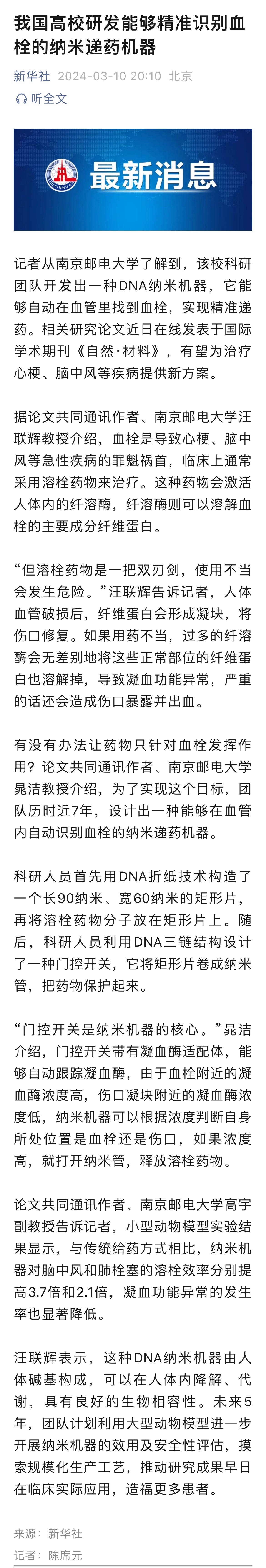 【新華社微信公眾號】我國高校研發能夠精準識別血栓的納米遞藥機器