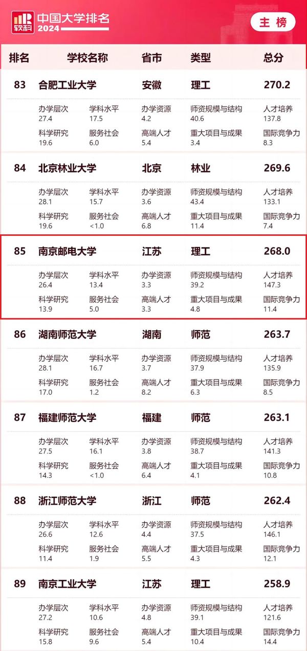 4月18日,軟科發布 “2024軟科中國大學排名”,南京郵電大學位列主榜第85名,理工類高校第35名,保持穩步前進態勢。