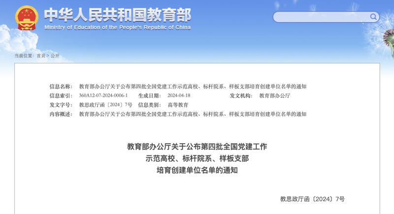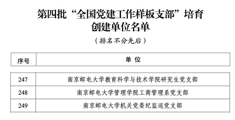 日前,教育部辦公廳公布了第四批全國黨建工作示范高校、標桿院系、樣板支部培育創建單位名單,南郵教育科學與技術學院研究生黨支部、管理學院工商管理系黨支部、機關黨委紀監巡黨支部入選教育部第四批全國黨建工作樣板支部培育創建單位。這是我校連續第3次獲批,也是首次同時入選3個全國黨建工作樣板支部培育創建單位。