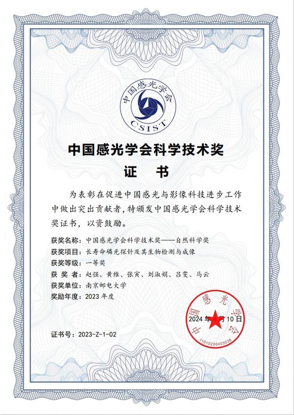 近日,中國感光學會發布2023年度中國感光學會科學技術獎授予決定,經資格審查、獎勵評審組專家評審、獎勵評審委員會評議、投票表決和常務理事會審定以及網站公示,我校趙強教授團隊完成的“長壽命磷光探針及其生物檢測與成像”項目獲中國感光學會科學技術獎——自然科學獎一等獎。該項目主要完成人為趙強、黃維、張寅、劉淑娟、呂雯、馬云,南京郵電大學為唯一完成單位。此項目是2023年度該學會獎唯一的自然科學獎類一等獎。
