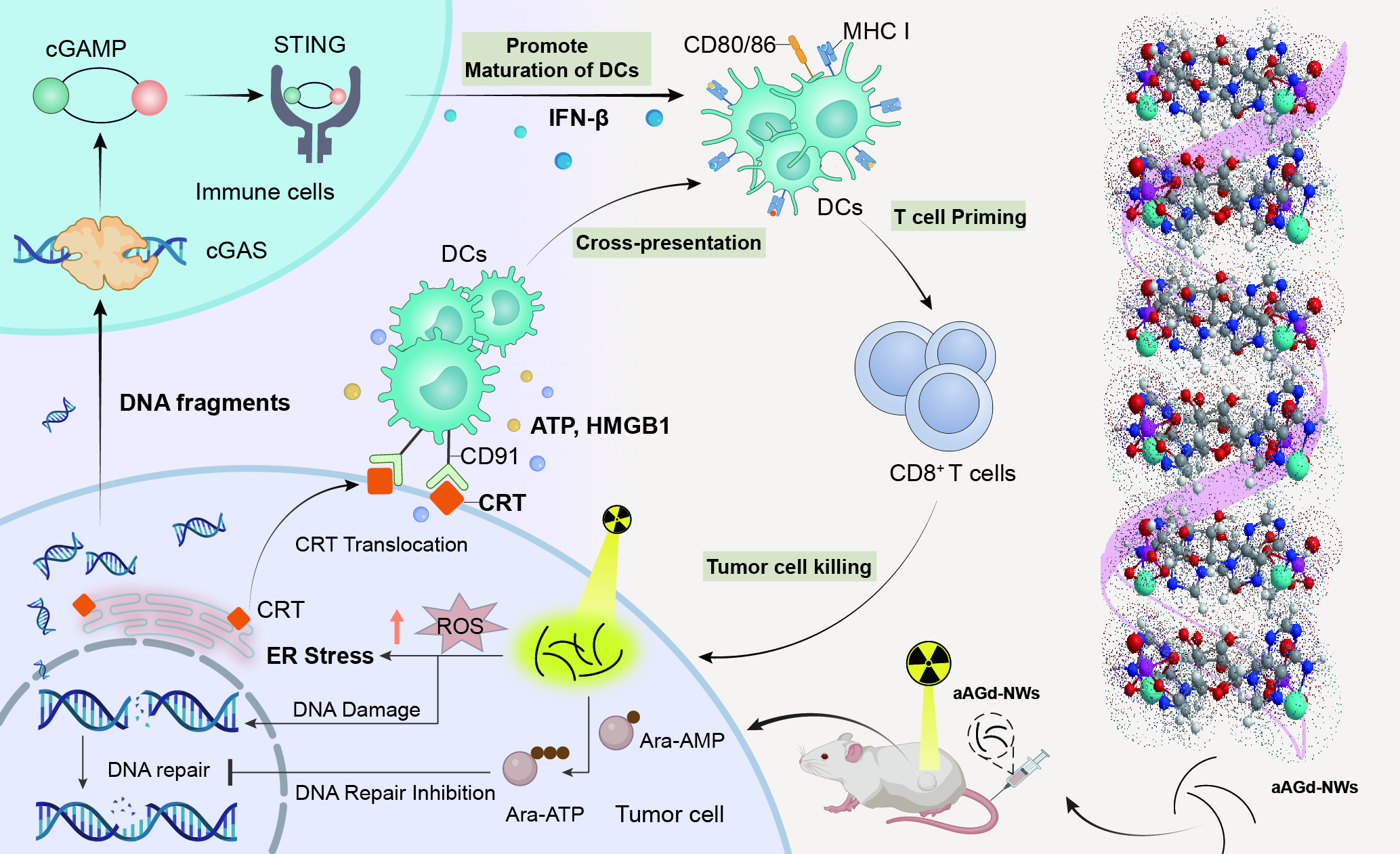 腫瘤的放射治療相當(dāng)于接種了內(nèi)源性原位疫苗,但這種僅由放射治療引發(fā)的內(nèi)源性原位疫苗的效應(yīng)非常微弱,幾乎不能誘導(dǎo)全身性的抗腫瘤免疫反應(yīng)。團(tuán)隊(duì)基于臨床抗病毒藥物(單磷酸阿糖腺苷)與核磁造影劑(釓離子)通過配位自組裝和相調(diào)控技術(shù),開發(fā)了手性阿糖腺苷磷酸釓納米線(aAGd-NWs)來增強(qiáng)放療誘導(dǎo)的腫瘤原位疫苗效應(yīng)。在清華大學(xué)崔曉亞博士、蘇家躍博士和劉濤老師的幫助下,團(tuán)隊(duì)通過冷凍透射電鏡解析了aAGd-NWs的結(jié)構(gòu)特征,包括超細(xì)形貌、表面配位和右手螺旋手性,并闡明了aAGd-NWs手性自組裝的機(jī)制。在生物機(jī)制上,aAGd-NWs不僅增強(qiáng)了X射線沉積和散射,增強(qiáng)放療的敏感性,而且有效抑制腫瘤細(xì)胞DNA的自我修復(fù),有效激活cGAS-STING通路促進(jìn)I型干擾素的分泌,增加了CD8+ T細(xì)胞在腫瘤組織中的浸潤。協(xié)同免疫檢查點(diǎn)阻斷療法顯著增強(qiáng)了放療誘導(dǎo)的原位疫苗效應(yīng)。