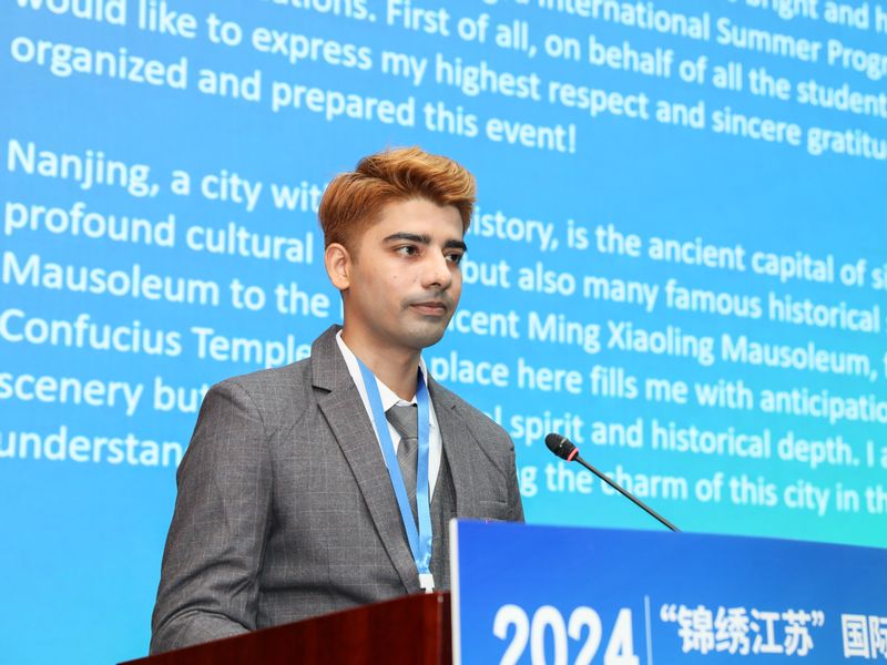 來自巴基斯坦的蘇仁作為國際學員代表發言。他用流利的漢語表達了對南京郵電大學的感謝,他說,“將珍惜難得的機會,和志同道合的伙伴們一起探索未知領域,鍛煉專業技能、團隊協作能力和創新思維。非常希望能夠體驗南京這座城市的魅力,了解中國傳統文化。”