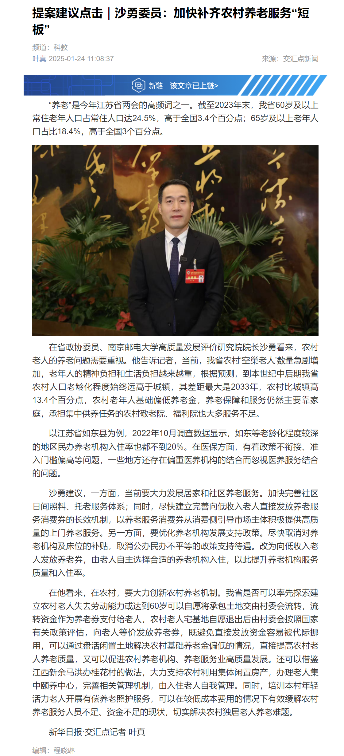 【新華日報客戶端】提案建議點擊|沙勇委員:加快補齊農村養老服務“短板”