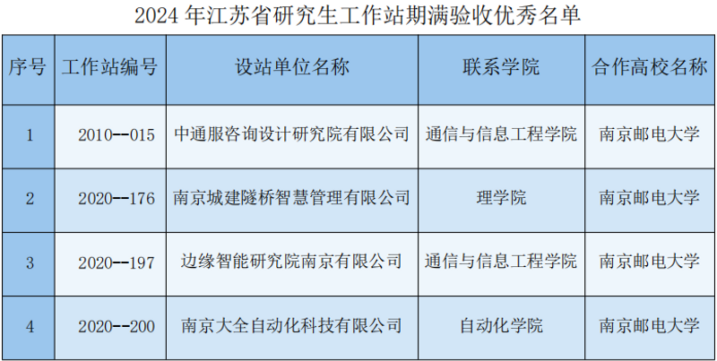 3月28日,江蘇省教育廳、省科技廳聯合公布“2024年江蘇省研究生工作站期滿驗收結果”,南京郵電大學參與考核的研究生工作站全部順利通過。其中,中通服咨詢設計研究院有限公司、南京城建隧橋智慧管理有限公司、邊緣智能研究院南京有限公司和南京大全自動化科技有限公司等4家研究生工作站獲評“江蘇省優秀研究生工作站”。