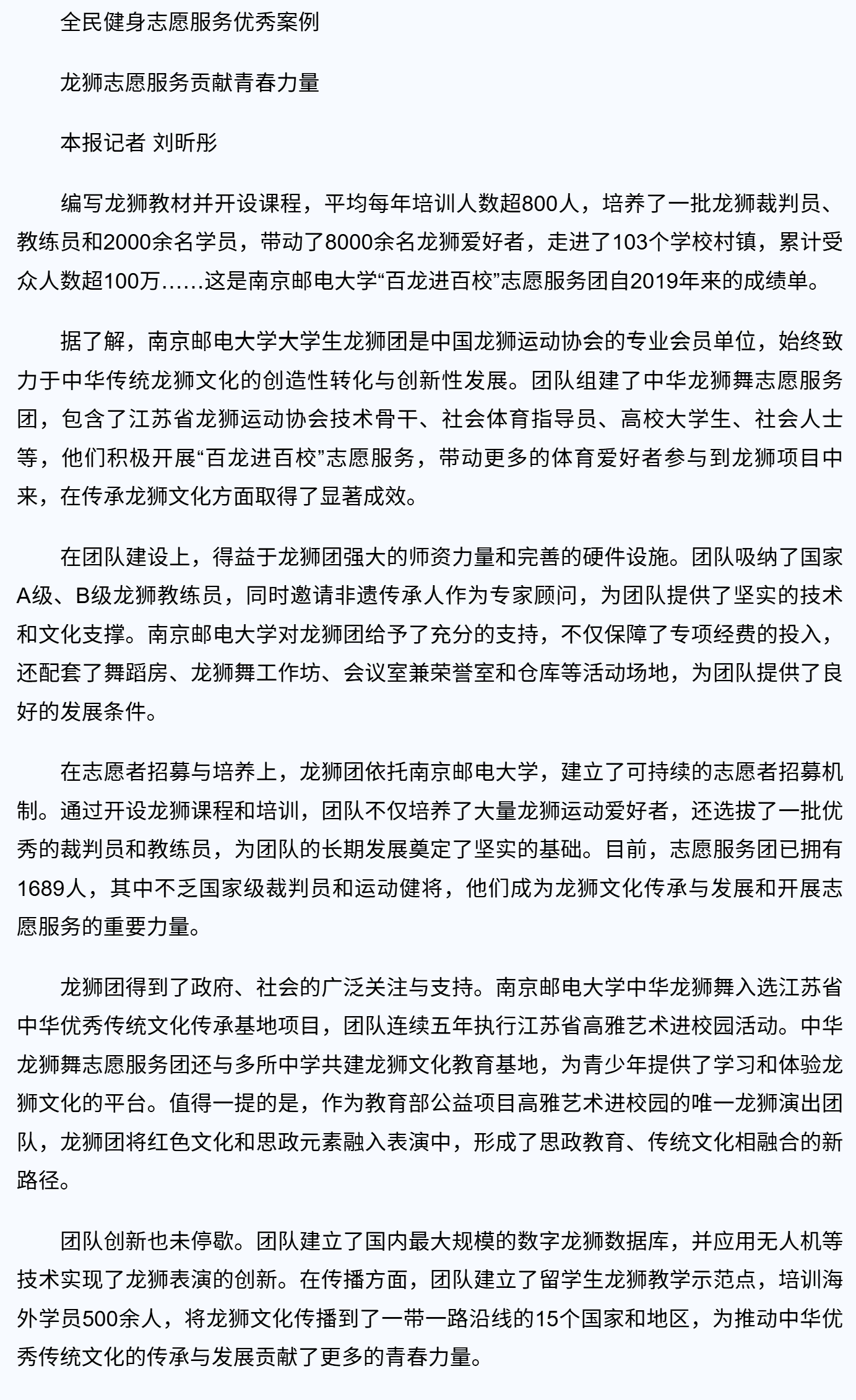 【中國體育報】龍獅志愿服務貢獻青春力量