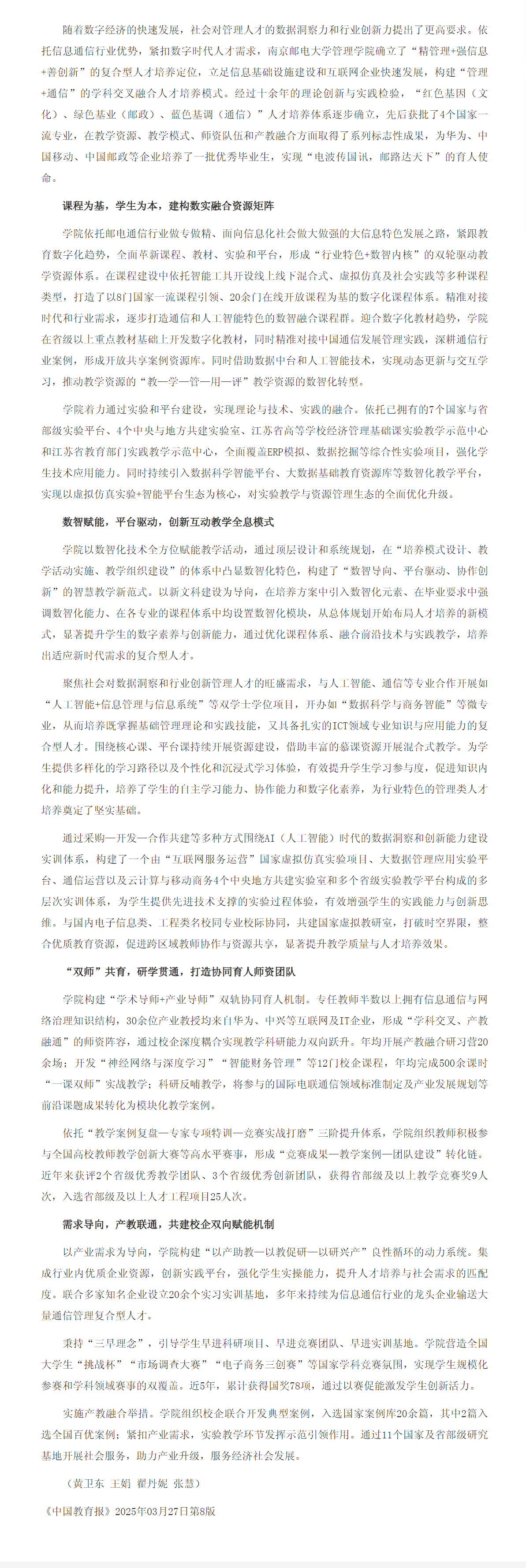 【中國教育報】南京郵電大學管理學院產教融合促發展 數智賦能育英才