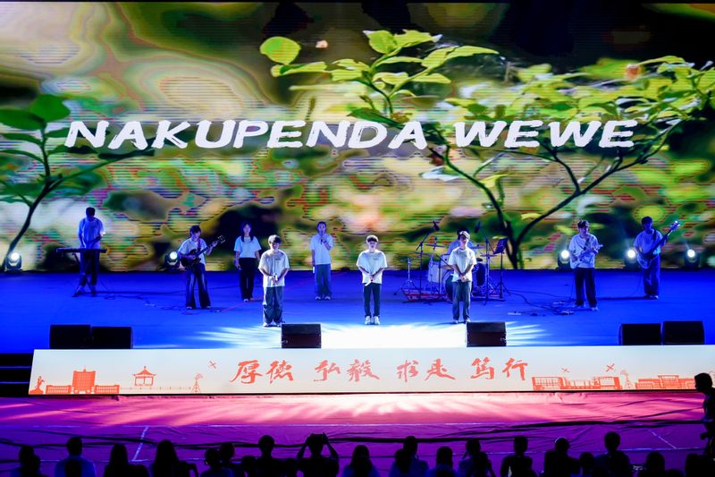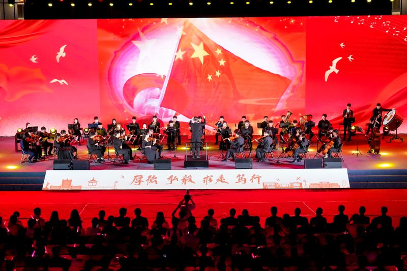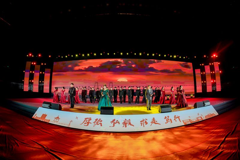 樂隊演奏《Amani》《無題》以深沉的立意和獨特的藝術表達引起觀眾共鳴,呼吁大家銘記抗戰歷史、珍視和平。合唱《沂蒙山歌+在森林的那一邊》用聲線交織訴說歲月情懷,描述大地織就的綠色夢境,每一片綠蔭下蟄伏著奇妙的故事;話劇《奔跑者》用舞臺敘事解構成長隱喻,通過講述我國通信事業從跟跑、并肩跑到世界領跑的故事,引發新生對“人生賽道”的深度思考;合唱《領航新時代》在聲浪中凝聚時代力量,離退休老教師代表印為民、楊庚與來自不同民族的同學們共同唱響對偉大征程的無限憧憬與堅定信念,用激情四溢的歌聲和熱情洋溢的表演展現對祖國的熱愛,56個民族像石榴籽一樣始終緊緊地團結在一起,共筑實現中華民族偉大復興的中國夢。