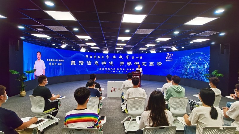 堅持信息特色,勇攀研究高峰。校黨委常委、副校長蔣國平教授以此為題于9月17日為研究生新生上專業教育第一課。蔣國平副校長向同學們介紹了我校研究生教育的發展歷程、主要成效和信息特色,對研究生新同學提出四點要求:一是守求真之本、厚德以修身,二是拓求新之路、弘毅以自強,三是秉求是之風、志高以行遠,四是揚求合之帆、篤行以致遠,并勉勵2022級研究生傳承“信達天下,自強不息”的南郵精神,在科學研究的道路上,志存高遠,敢于擔當,堅持信息特色,勇攀研究高峰,以優異成績迎接黨的二十大勝利召開。