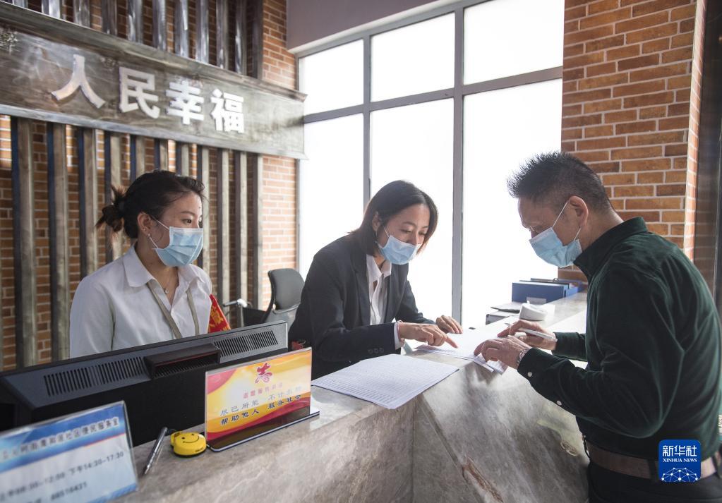 2020年9月18日,湖北省武漢市青和居社區服務中心工作人員協助社區居民填寫材料。