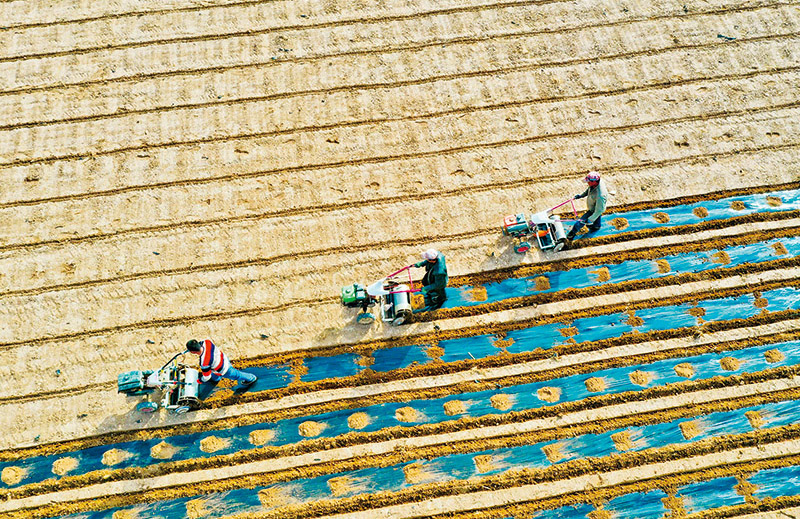 一年之計在于春。做好春耕備耕工作,事關糧食安全大局。圖為2022年3月11日,在甘肅省張掖市臨澤縣平川鎮一工程村6500多畝制種玉米地里,農戶們正忙碌著覆膜保墑。 求是圖片 王將/攝