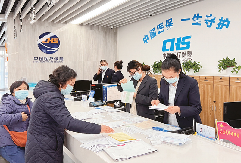 中國用較短時(shí)間建立起世界最大的全民基本醫(yī)療保障網(wǎng),對(duì)破解群眾看病難看病貴問題、支持醫(yī)藥衛(wèi)生事業(yè)發(fā)展、維護(hù)社會(huì)穩(wěn)定和推動(dòng)共同富裕發(fā)揮了重要作用。圖為2022年3月1日,甘肅省酒泉市醫(yī)保經(jīng)辦窗口工作人員正在為群眾辦理醫(yī)保業(yè)務(wù)。 國家醫(yī)療保障局供圖 鄭惠亞/攝