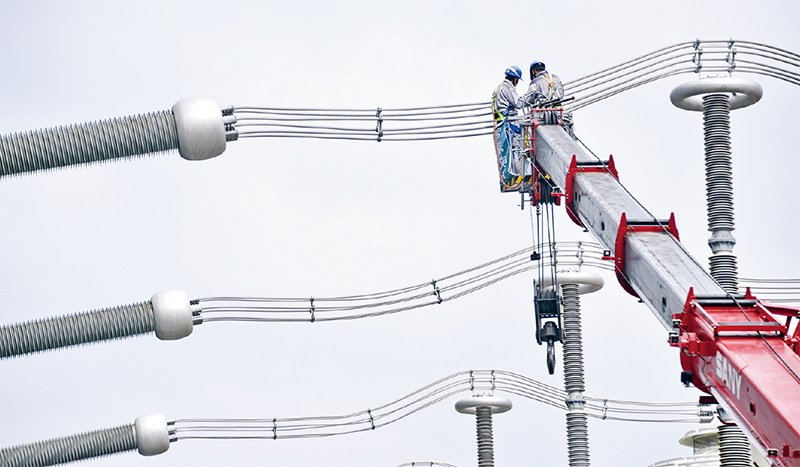 采取國產核心技術和關鍵設備的張北柔性直流電網是目前國內電壓等級最高的柔性直流電網。2022年北京冬奧會期間,作為綠色電能輸送主通道,確保了所有冬奧會場館使用上百分之百的綠色電能。圖為2021年9月25日,張北柔性直流電網延慶換流站員工在檢查輸變電設備。 新華社記者 李欣/攝
