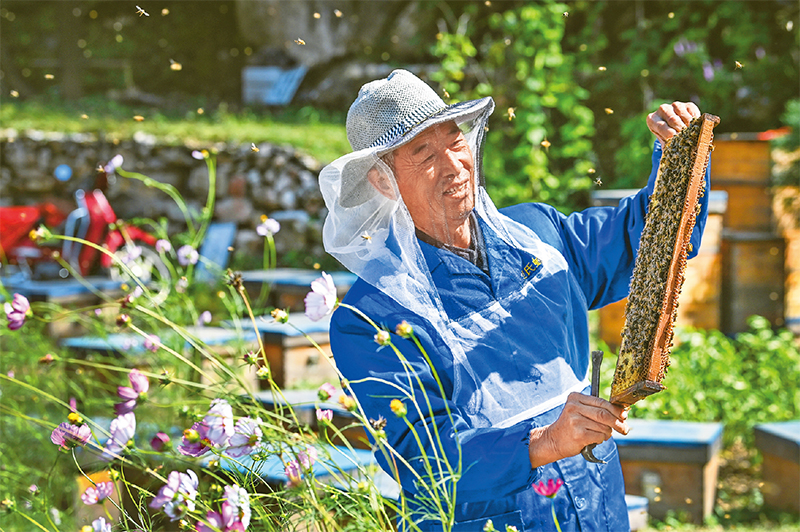 共同富裕要靠勤勞智慧來創造。山西省大同市靈丘縣充分發揮自身資源特色和優勢,走上了生態優美、產業興旺、生活美好的“農業+旅游”致富路。圖為2021年9月23日,靈丘縣邊氏養蜂專業合作社社員在檢查蜂箱情況。 新華社記者 柴婷/攝
