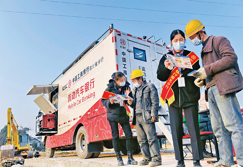 服務實體經濟是金融的天職和宗旨,也是防范化解金融風險的根本舉措。中國銀保監會持續引導金融機構強化小微企業、“三農”和扶貧等領域金融支持。圖為2021年1月14日,在四川省南充市順慶區金臺鎮南田寺村的川渝柑橘現代種業園項目建設現場,中國工商銀行四川南充分行“流動汽車銀行”巴士開進了工地,為農民工制卡、補卡、宣傳金融知識等。 中新社發 李向雨/攝